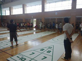 「シャッフルボード」は、カーリングみたいにコマを棒で押し込んで、マット上に書いてある点数